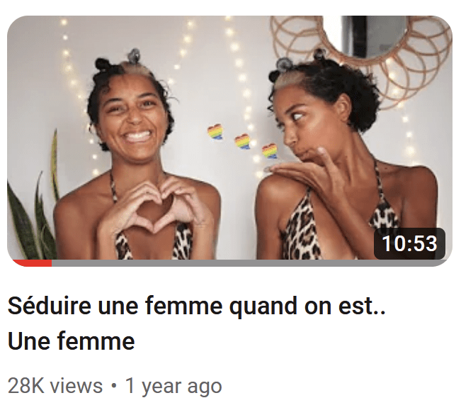 Sa vidéo YouTube « Séduire une femme quand on est… Une femme » (octobre 2021) évoque son expérience sur les applications de rencontre. Pour elle, les schémas de l’hétérosexualité peuvent mener à ne pas savoir qui doit initier la séduction quand on se retrouve entre femmes, ou à craindre de reproduire des comportements gênants qu’on a nous-mêmes vécus au contact d’hommes lourds. La solution qu’elle propose est de verbaliser son attirance, son stress, son envie d’embrasser l’autre, etc. D’après elle, dire ouvertement comment on se sent permet d’enlever un poids de ses épaules, mais également de celle des autres. Elle propose même d’utiliser différents modes de communication en précisant qu’on peut le dire avant, pendant ou même par message après le date. Une centaine de commentaires évoquent des conseils, des expériences ou des craintes sous sa vidéo.