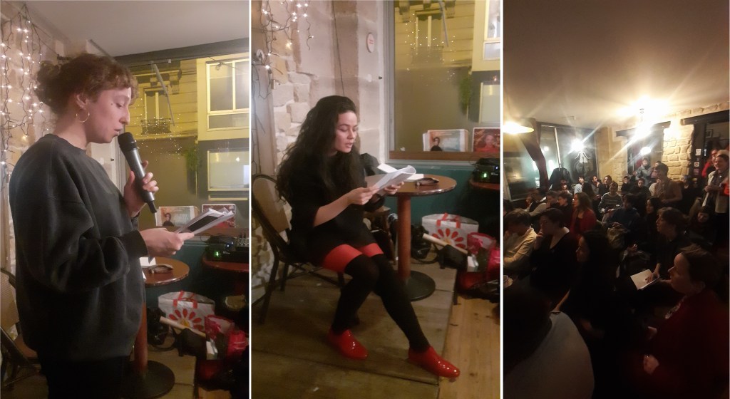 La salle était pleine à craquer pour cette soirée de lancement. C’est avec un grand plaisir que j’ai porté ce projet de zine, lu toutes les participations et échangé avec les auteurices. Encore un grand merci aux auteurices qui sont venu-es à la soirée de lancement, et au public qui s’est déplacé pour fêter cette sortie avec nous. Merci également au Bonjour Madame qui nous a accueillis dans leur bar.
