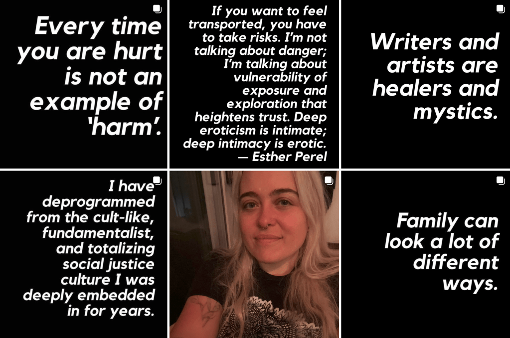Clémentine Morrigan est une autrice canadienne connue pour ses textes controversés sur la pratique des call-out (dénonciation publique) et du cancel (NdlA : « annulation » en anglais, se dit de l’isolement des personnalités jugées problématiques à gauche) dans la communauté féministe et queer de gauche. Elle écrit également sur la politique, la sexualité et le trauma. L’artiste autopublie ses ouvrages sous la forme artisanale du zine, ces feuillets imprimés et assemblés à la main, qui circulent dans les milieux anarchistes et DIY. Cependant, loin d’être une autrice confidentielle, son parcours en dehors du milieu de l’édition classique a attiré une centaine de milliers de lecteurs. Son compte Instagram est suivi à ce jour par 111 000 abonnés (@clementinemorrigan). Il y a donc d’une part sa pratique du zine, qu’elle exerce toujours aujourd’hui, et d’autre part sa pratique de la microécriture, où elle poste de façon condensée de très courts textes en blanc sur fond noir, sa signature sur Instagram. Elle vit aujourd’hui intégralement de la vente de ses zines et de ses textes, ce qui est une situation rare dans le paysage des auteurs, où mêmes les auteurs publiés ont de la peine à vivre de leur écriture, en particulier les auteurs militants.